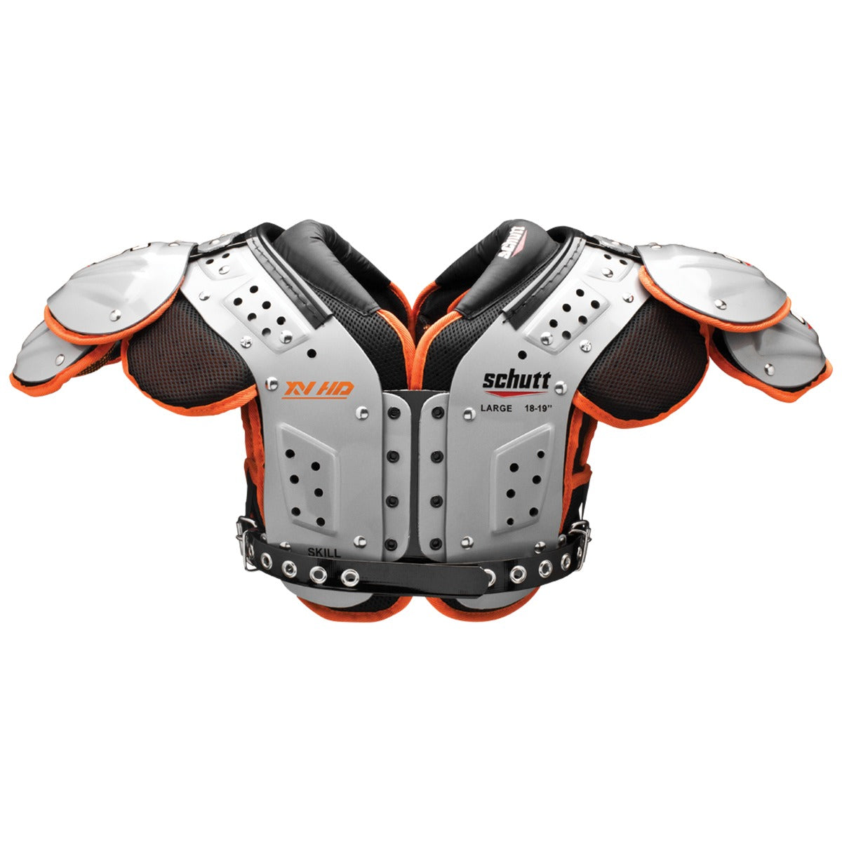 Schutt Adult XV HD Skill RB/TE/DB Shoulder Pad The XV HD is the shoulder pad against which all high school shoulder pads are measured. The XV HD has many of the same features as Schutt’s pro-level shoulder pads and was upgraded this season with higher-density EVA foam for greater impact absorption and durability. The moisture and heat management system of the XV HD allows airflow to and from the body allowing the skin to dry and the body to continue its natural cooling action. The XV HD Skill gives you a deep cut for a wide range of motion while still maintaining a long cut to give you the protection you need. Tactical Arch Design High performance arch designs to minimize weight without sacrificing hitting zone protection. These new arches are engineered for maximum range of motion and mobility. Streamlined and balanced arch designs to keep arches and cushions in proper hitting position with less -upward- movement of shoulder pads. Newly designed, positioned and sized epaulets and caps (low profile) eliminating -grab- points and creating better overall performance. Raised corrugations for additional strength and increased air flow. Heat and Moisture Management System High density EVA foam is perforated throughout the body cushion allowing heat and sweat to escape and evaporate. The ventilated arch has raised corrugation and 7 mm vent holes to allow heat to escape and excess sweat to evaporate. Multi-Axis air flow channels maximizes breathability. Clavicle Channel System This system absorbs impact specifically around the AC joint and provides maximum shoulder protection. The hook and loop pad attachments can be re-positioned or removed to ensure a precise fit and coverage in the key hitting areas. Other Design Features Flat Pad Design is low profile for improved mobility. BIOTHANE belts create a snug and secure fit while maintaining the shape of the arch to maximize range of motion. Pre-drilled for Accessory attachment. Removable deltoid and scapular pads. Stainless Steel hardware. Removable body for easy hand washing of cushions. The lightest varsity shoulder pad we can build while maintaining high performance standards. Positions: Running Back, Tight End, Safety, Defensive Back.